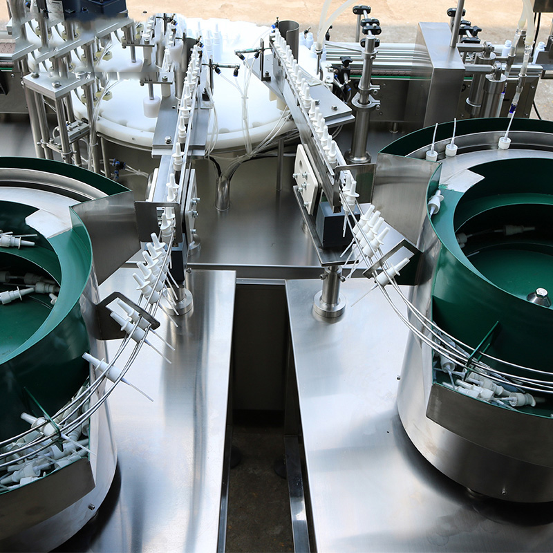 由供瓶、灌裝、上內(nèi)塞、外蓋、旋蓋、貼標(biāo)等主要部分組成。通過(guò)全自動(dòng)理瓶機(jī)或供瓶機(jī)把瓶子輸送到光眼檢測(cè)處,然后進(jìn)行灌裝,震蕩盤理蓋上蓋后旋蓋,工序完成后可加貼標(biāo)機(jī)、打碼機(jī),再送出到收瓶機(jī)。